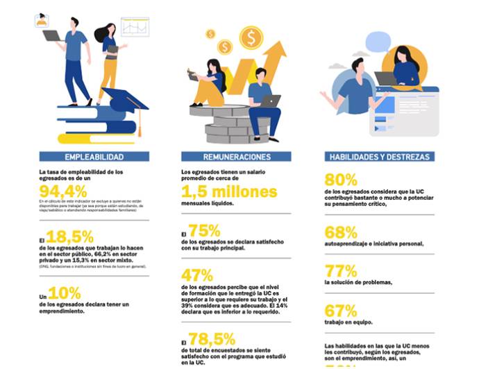 La última edición del periódico de la comunidad universitaria, Visión UC, releva como noticia principal la alta tasa de empleabilidad que han alcanzado quienes egresaron entre el periodo 2016-2020: 94,4%. Según un estudio de la Dirección de Análisis Institucional y Planificación de la UC, de las 6.453 personas que respondieron el sondeo, 66,2% trabaja en el sector privado, 18,5% en el público y 15,3% en el mixto.